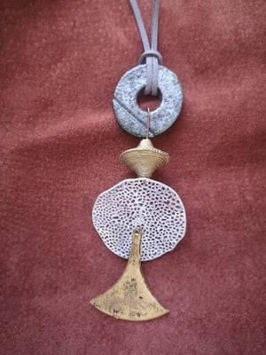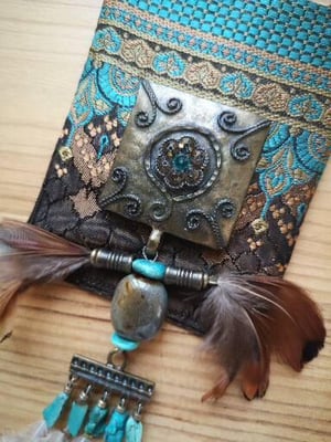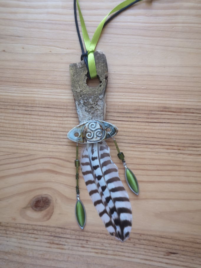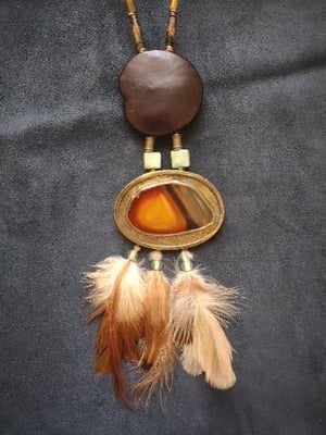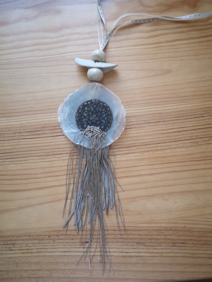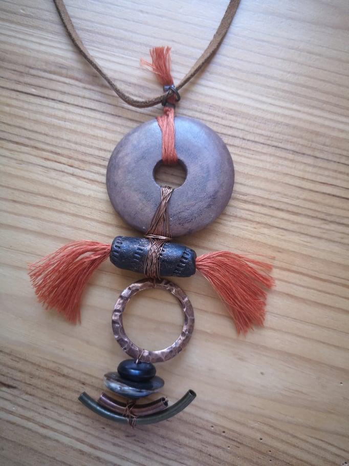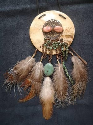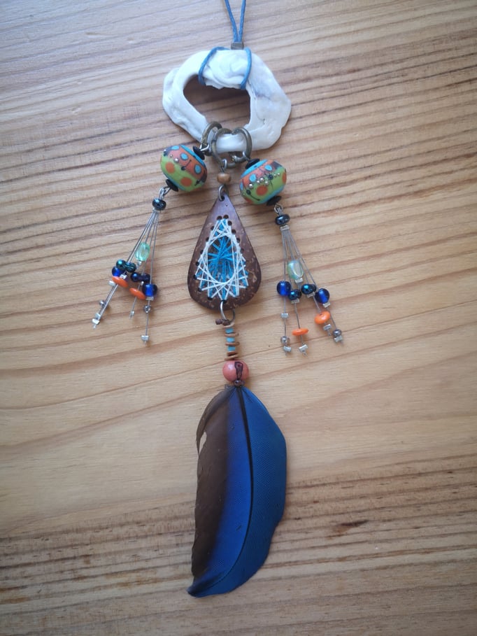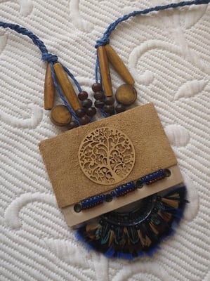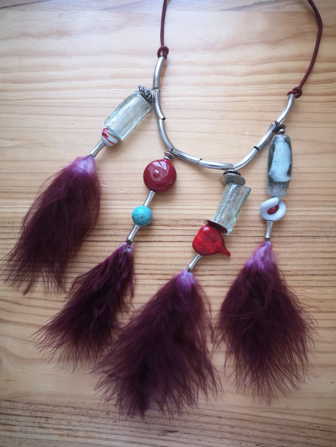 Mes créations sont des bijoux ethniques contemporains, mélanges de matières diverses (cuir, bois, argile, plumes, perles, perles de Murano (Venise), pierres semi-précieuse, métal, pâte de verre, tissu, ...) dans différents styles (amérindien, africain, tibétain notamment, d'autres pièces sont tout simplement "féminines") ; Ce sont des pièces uniques qui peuvent être portées ou encadrées selon votre souhait ; chaque pièce est vendue avec un processus de nettoyage énergétique et requière le plus grand soin.