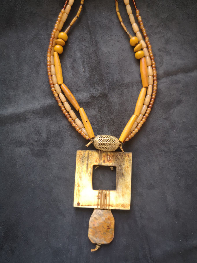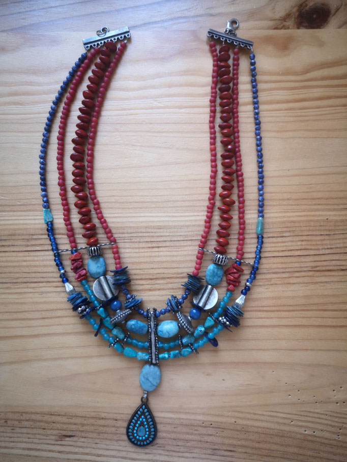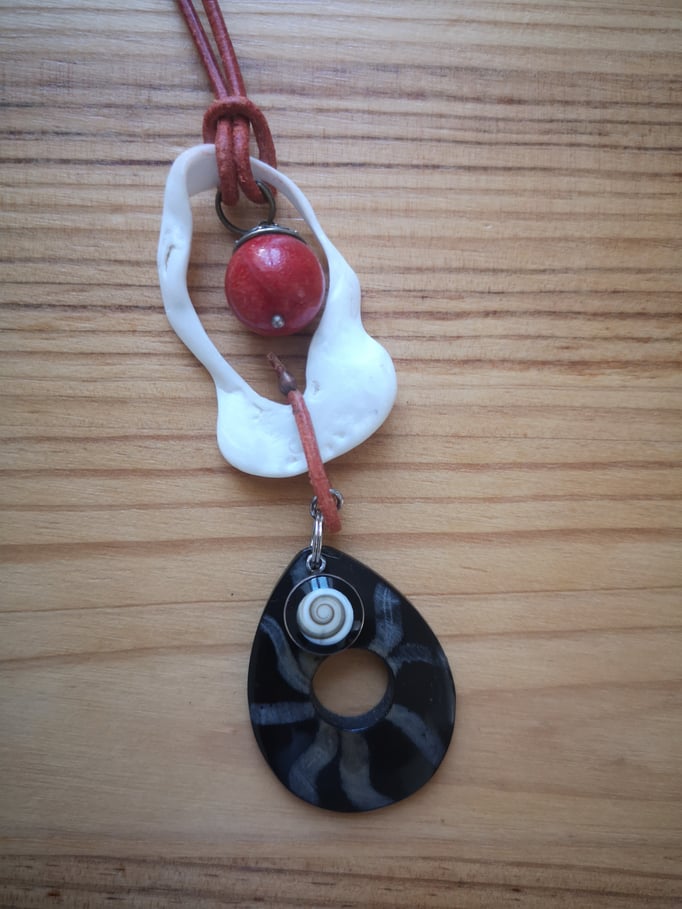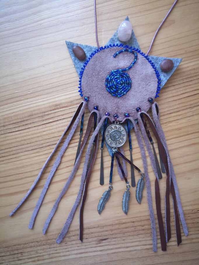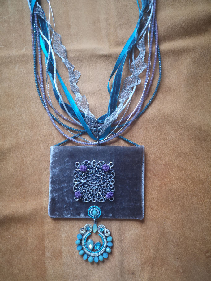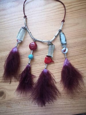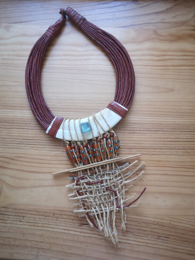 Mes créations sont des bijoux ethniques contemporains, mélanges de matières diverses (cuir, bois, argile, plumes, perles, perles de Murano (Venise), pierres semi-précieuse, métal, pâte de verre, tissu, ...) dans différents styles (amérindien, africain, tibétain notamment, d'autres pièces sont tout simplement "féminines") ; Ce sont des pièces uniques qui peuvent être portées ou encadrées selon votre souhait ; chaque pièce est vendue avec un processus de nettoyage énergétique et requière le plus grand soin.